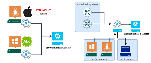 Securonix with NXLog provides log collection with multi-platform support as shown in the figure below. With agent-based log collection, NXLog runs as an agent on the system that is generating the log data. It collects the log data and sends it to another NXLog instance over the network. It supports platform specific sources such as the Windows Event Log, Linux kernel logs, Android logs, local syslog, and more.