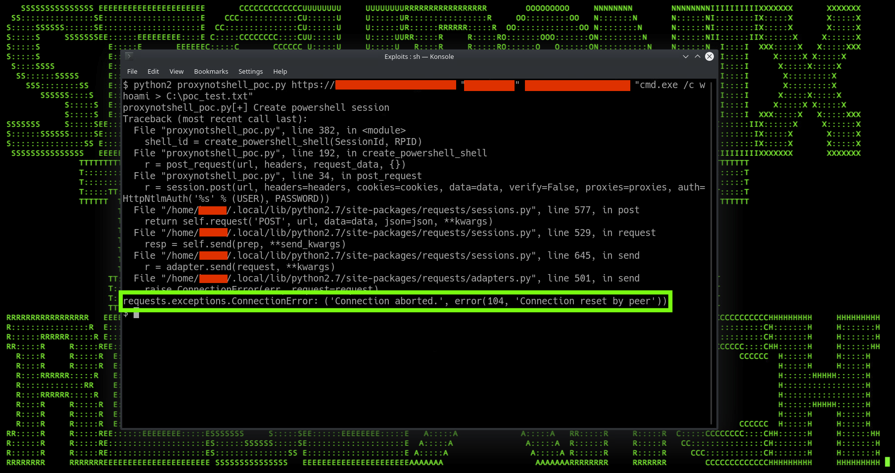 With the only difference being EEMS enabled, we can see that the connection fails once the PoC code is executed. This proves that EEMS implementation of using a URL rewrite to mitigate ProxyNotShell is effective against a legitimate exploitation attempt.