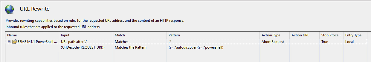 When ProxyNotShell came to light, Microsoft was quick to leverage the EEMS service to mitigate the vulnerability. The mitigation can be found in the Exchange server’s IIS configuration and consists of a URL rewrite as seen in the figure below.