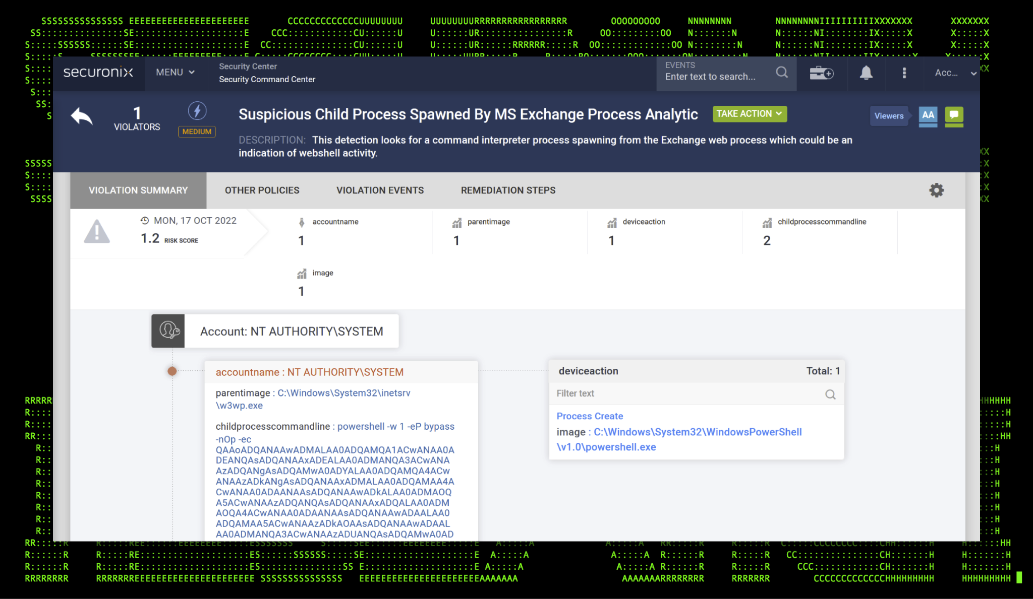 This data can then be taken and easily converted into a policy which looks for cmd.exe or powershell.exe being called from w3wp.exe as a parent process. With the policy in place, we are able to detect a different, interesting and very actionable violation shown in the figure below.