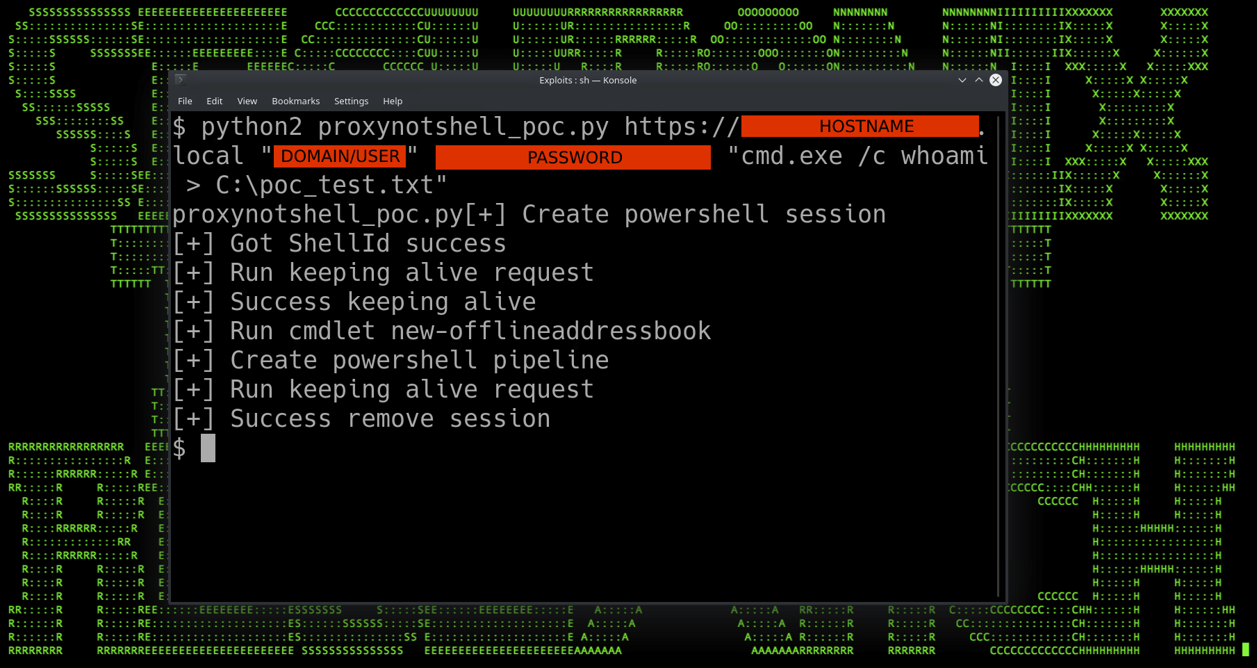 As mentioned earlier, there’s been some publicly available exploits released for ProxyNotShell. One example that recently surfaced was an exploit for ProxyNotShell which was coded in the Python2 programming language. It requires very minimal effort to set up and as you can see in the figure below, it reported that our command “cmd.exe /c whoami > C:\poc_test.txt” ran successfully.