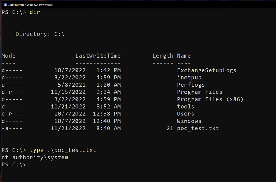 But did it actually execute? Let’s inspect the target host. If we’re “lucky” we should see a newly created file called “poc_test.txt” on the root directory of the C:\ drive containing the text: “nt authority\system”. Remember the System user is the default builtin account that the exchange process w3wp.exe runs as.