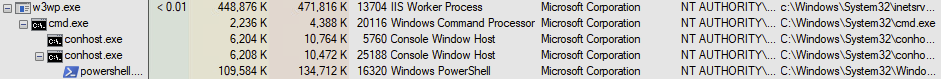 Figure 7: Exploited w3wp.exe calling cmd.exe/powershell.exe