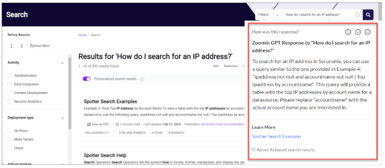 The Securonix Documentation Portal now supports Zoomin GPT Search, which uses OpenAI’s breakthrough technology to offer highly relevant results to your search queries. In order to generate an answer, Zoomin GPT Search uses the entire spectrum of content consolidated in the Securonix Documentation Portal, including content presented in tables. Zoomin GPT’s answer is presented alongside the standard search results and takes into account any search filters that have been applied. The Portal’s intelligent keyword extraction provides OpenAI with the required context to retrieve highly relevant results, so you can quickly get answers to your questions.
