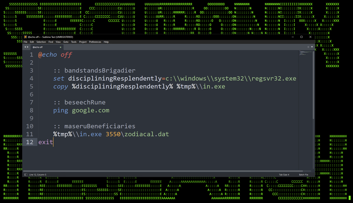 The methodology varied from sample to sample. In some cases, portions of the “regsvr32.exe” binary name are stored as variables and called randomly towards the end of the script. We also observed, portions of the binary name being fed in as parameters when executing the .cmd file.