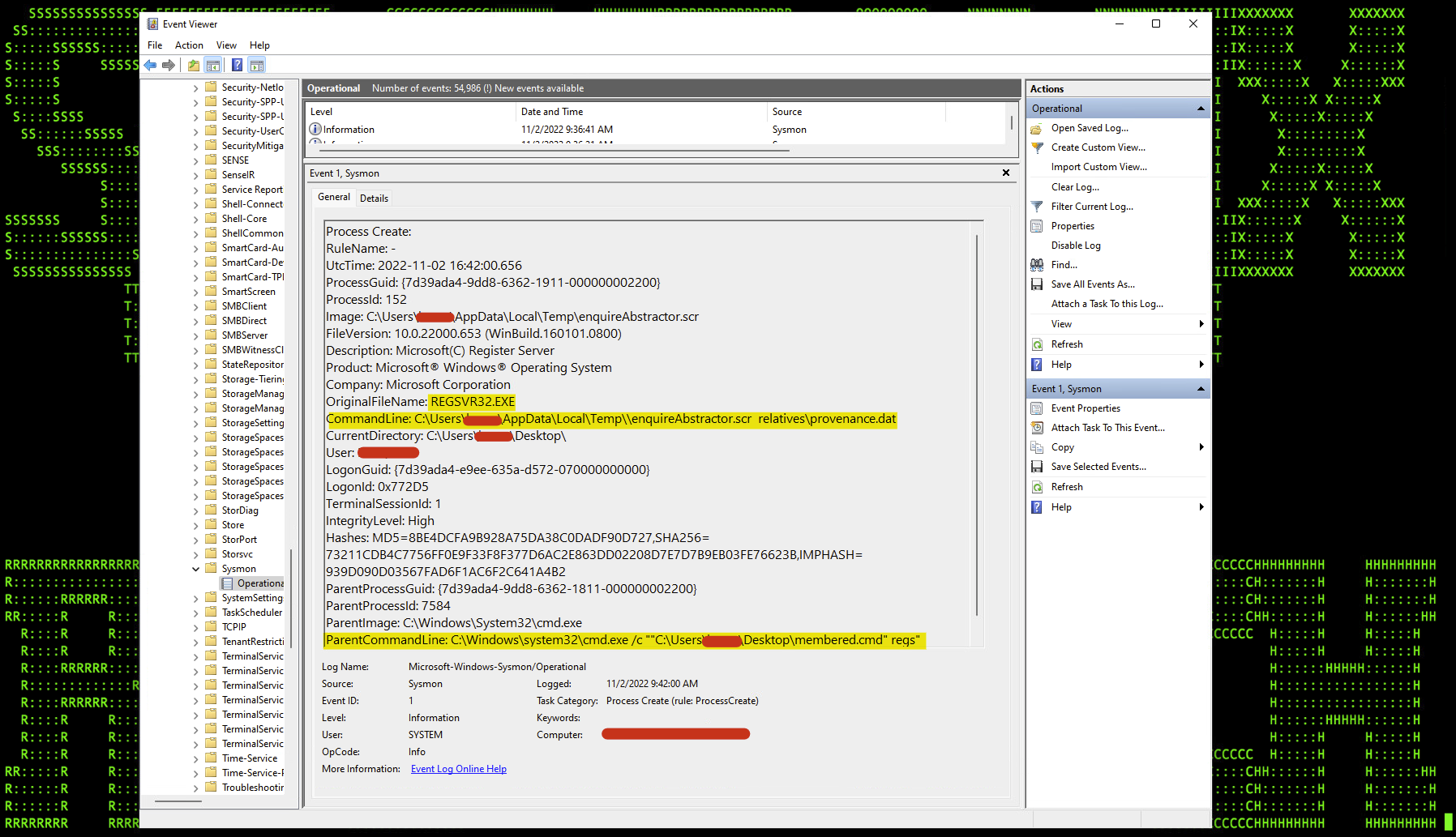 Let’s take a look at some Sysmon logs from another sample. This particular sample would heist regsvr32.exe from the System32 directory as we saw in a previous example. The file would be once again moved to the user’s %tmp% directory and renamed to “enquireAbstractor.scr”.