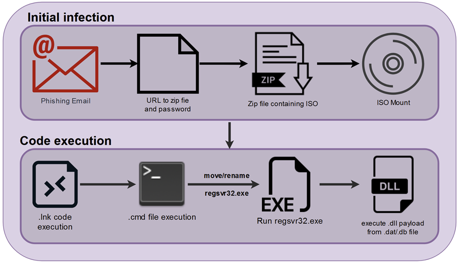 The zip file contains an image disk file (typically an .iso file) which is revealed after downloading and extracting its contents. Code execution begins when the user clicks the .LNK file contained inside the .iso file once mounted. .LNK file execution is becoming more popular as a method of code execution, which likely grew in popularity after Microsoft announced that VBS macros would be disabled by default for MS Office applications.
