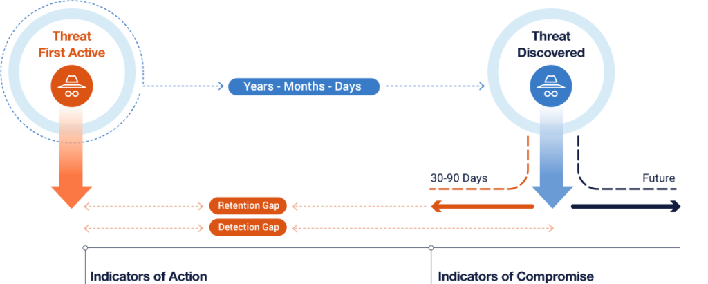 In searching for an answer we also quickly realized that while most detection technologies sooner or later release a suitable signature, they often only work on traffic generated during the early phases of a new intrusion. The indicators of compromise (IOCs) and observables in these types of attacks are often historical in nature, and an attacker has had a long time to build out their foothold and hide their traces.