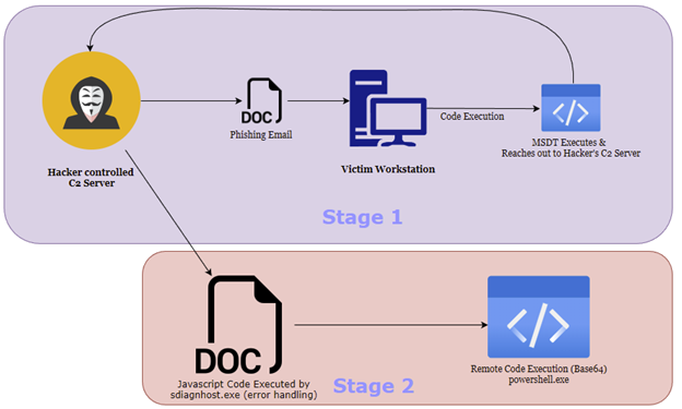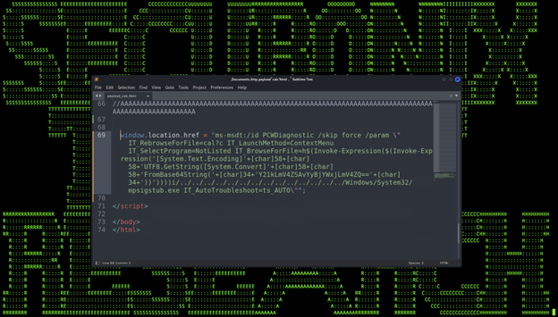 When the document file is opened by the victim, since it was originally modified by the attacker, MSDT will run and execute the malicious code in the remote HTML file. Since this file is under the control of the attacker, it is up to the attacker’s imagination as to what will execute. From what we’ve seen in the wild, the most likely scenario would be base64 encoded PowerShell. The PowerShell could really run anything ranging from opening up a backdoor to downloading and running malware.