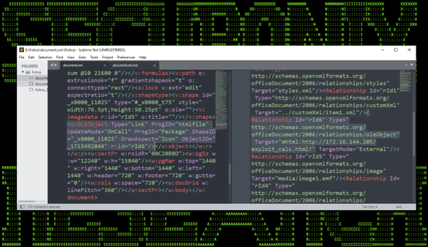 The exploit works by leveraging a few small code changes inside the document which reference how embedded OLE objects are contained in the document. In a nutshell, Microsoft Office files are considered compound container files. Inside these files, the two that we’re interested in are document.xml and word/document.xml.refs. The reference code to an OLE object can be modified to connect to a remote HTML file on a remote server as seen in Figure 2 below.