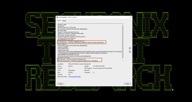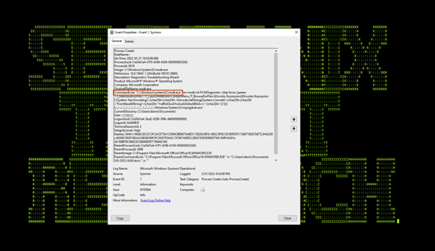 When the malicious document is executed, we notice some interesting process activity coming from Sysmon logs. Some of this activity can be used for building out reliable detections. The first is Microsoft Word (winword.exe) executing MSDT as a child process (msdt.exe). When command line logging is enabled, we can see the entire command string that would have been present in the attacker’s remote HTML file passed from ms-msdt as seen in figure 4.