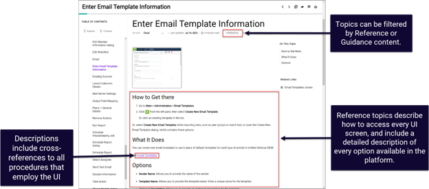 The Reference includes a comprehensive description of the UI as well as other architectural and reference information. Reference topics include links to the procedures they are used for.