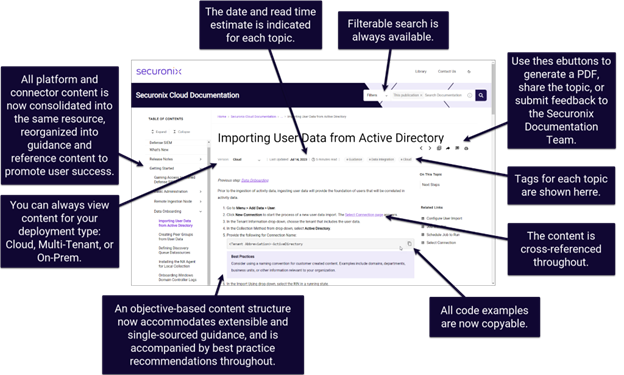 Every step of the user journey, from logging in, to ingesting data, to optimizing UEBA policies is now represented in detailed, orderly, cross-referenced procedures. These procedures are designed to achieve specific objectives, and are at the core of Securonix documentation, supported by the remaining content. The Getting Started and User Guide sections include these procedures.