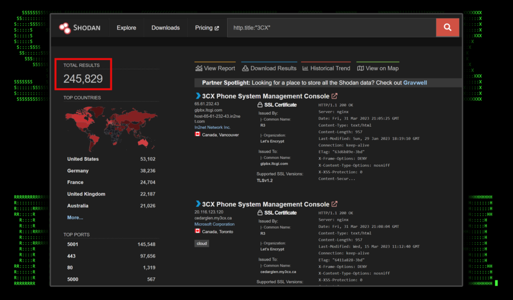 The 3CX VoIP system is hugely popular and used by hundreds of thousands of customers world-wide, includingand used by some large well- known organizations. A supply chain attack at this size has the potential for being one of the worst since the Solar Windows attack in 2020. At the time of writing, there are approximately 245,000 3CX management systems exposed to the internet according to Shodan.