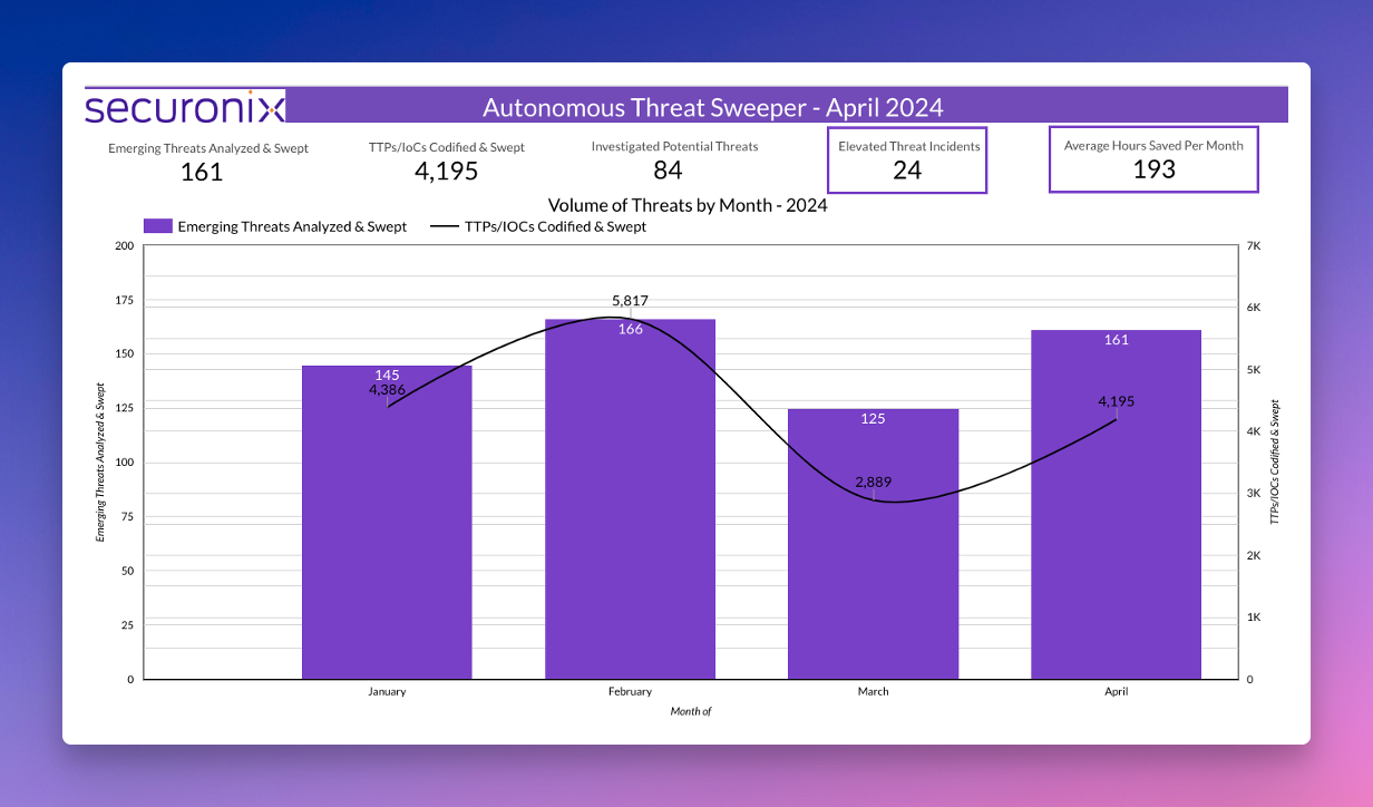 Last month Securonix Autonomous Threat Sweeper identified and analyzed 3,195 TTPs and IoCs, 161 emerging threats, investigated 84 potential threats, and elevated 24 threat incidents. The top data sources swept against include Cloud Application Audit, Cloud Content Management, Cloud Antivirus/Malware/EDR, Data Loss Prevention, and Email/Email Security.