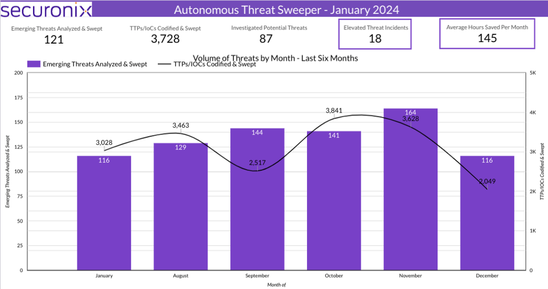 Last month Securonix Autonomous Threat Sweeper identified and analyzed 3,728 TTPs and IoCs, 121 emerging threats, investigated 87 potential threats, and elevated 18 threat incidents. The top data sources swept against include Cloud Application Audit, Cloud Content Management, Cloud Antivirus/Malware/EDR, Data Loss Prevention, and Email/Email Security.