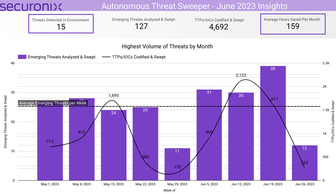 In June 2023, Securonix Autonomous Threat Sweeper identified 4,692 TTPs and IoCs, 127 distinct threats, and reported 15 threat detections. The top data sources swept against include IDS/IPS/UTM/Threat Detection, Endpoint Management Systems, Data Loss Prevention, and Email/Email Security.