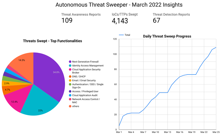 In March, Securonix Autonomous Threat Sweeper identified 4,143 IOCs, 109 distinct threats, and reported 67 threat detections. The top data sources swept against include Next Generation Firewall, Identity Access Management, DNS / DHCP, and Cloud Application Security Broker.