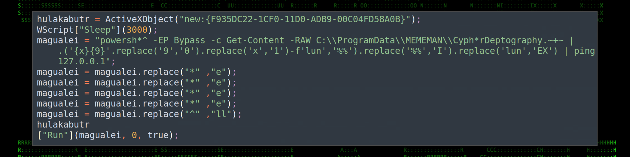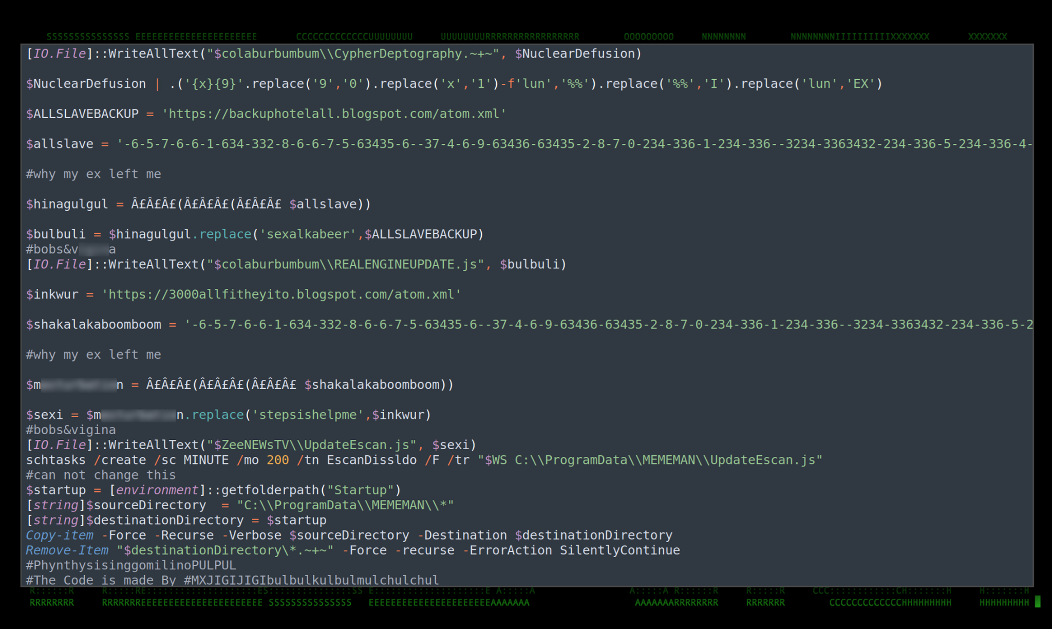 The code referenced in the first half of the script is written to disk and saved in the  “C:\ProgramData\MEMEMAN” directory as “CypherDeptography.~+~” using the PowerShell [IO.File]::WriteAllText method.