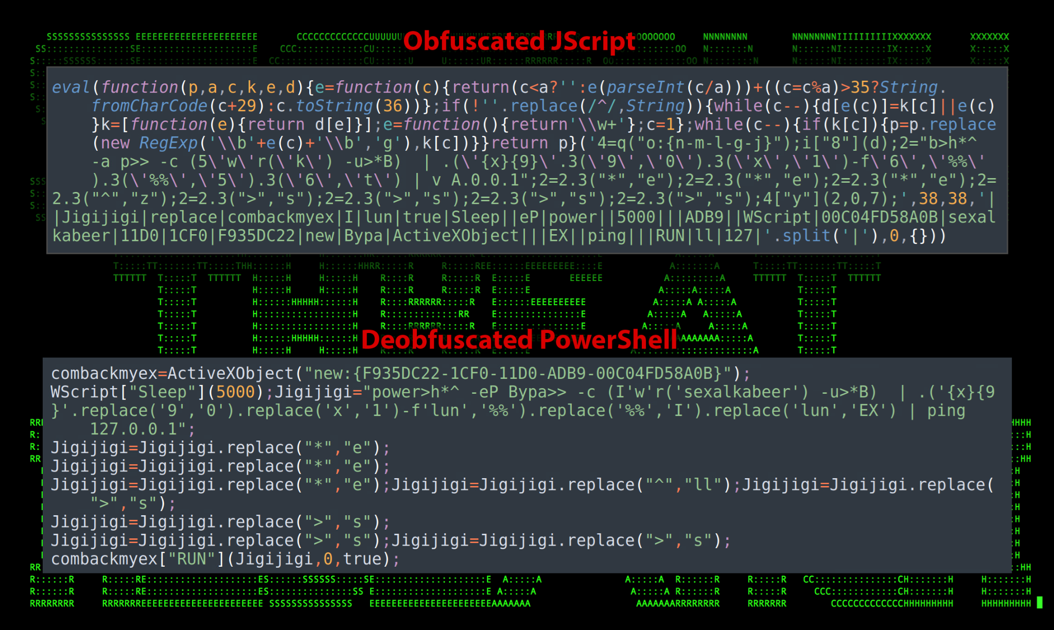 Figure 10: $allsave JScript and deobfuscated PowerShell code