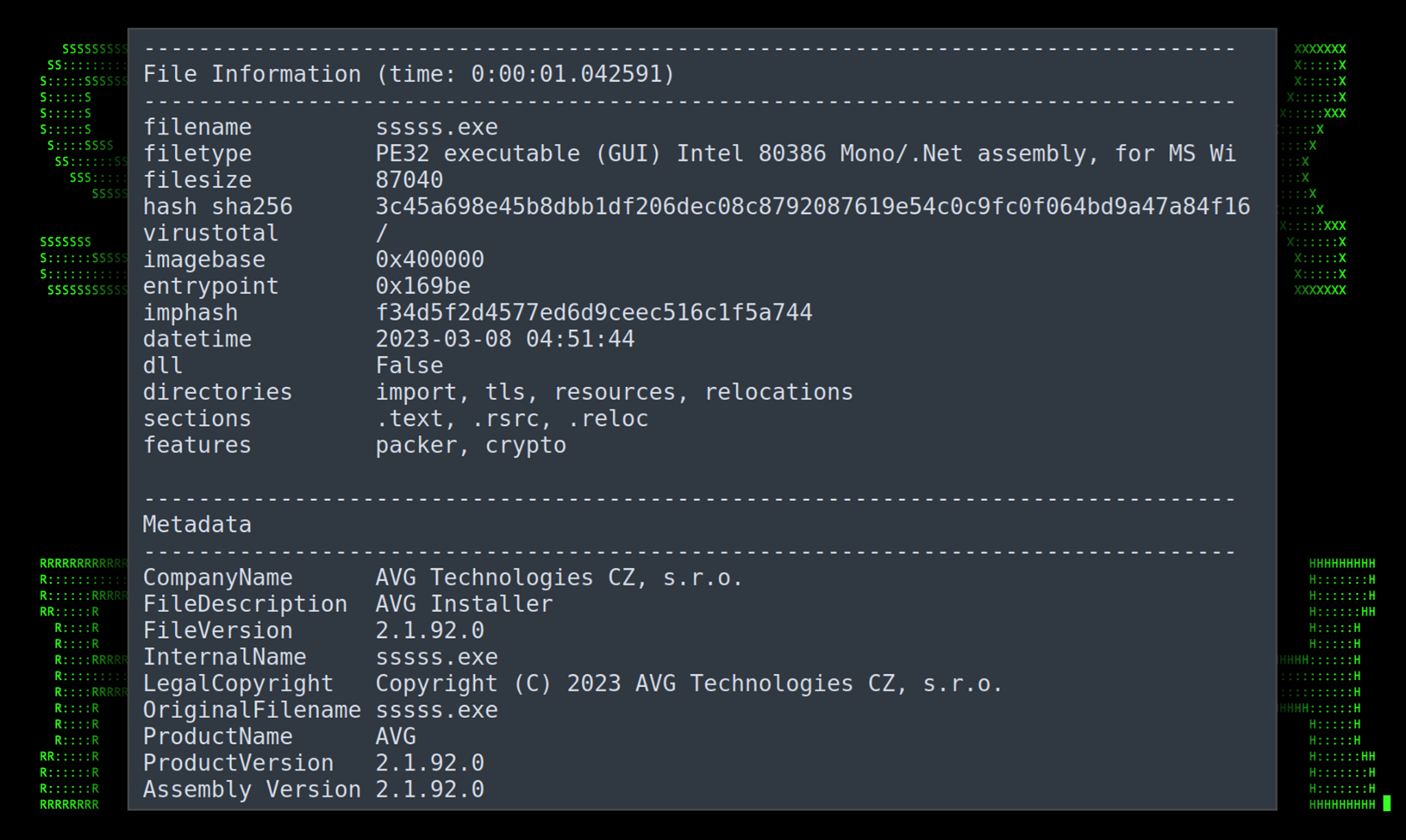 The executable is overall quite small, at around 85KB and was compiled using VS. Taking a look at the metadata in the figure below it appears to pattern itself off of what you might find for an AVG install file, though this executable  was not digitally signed.