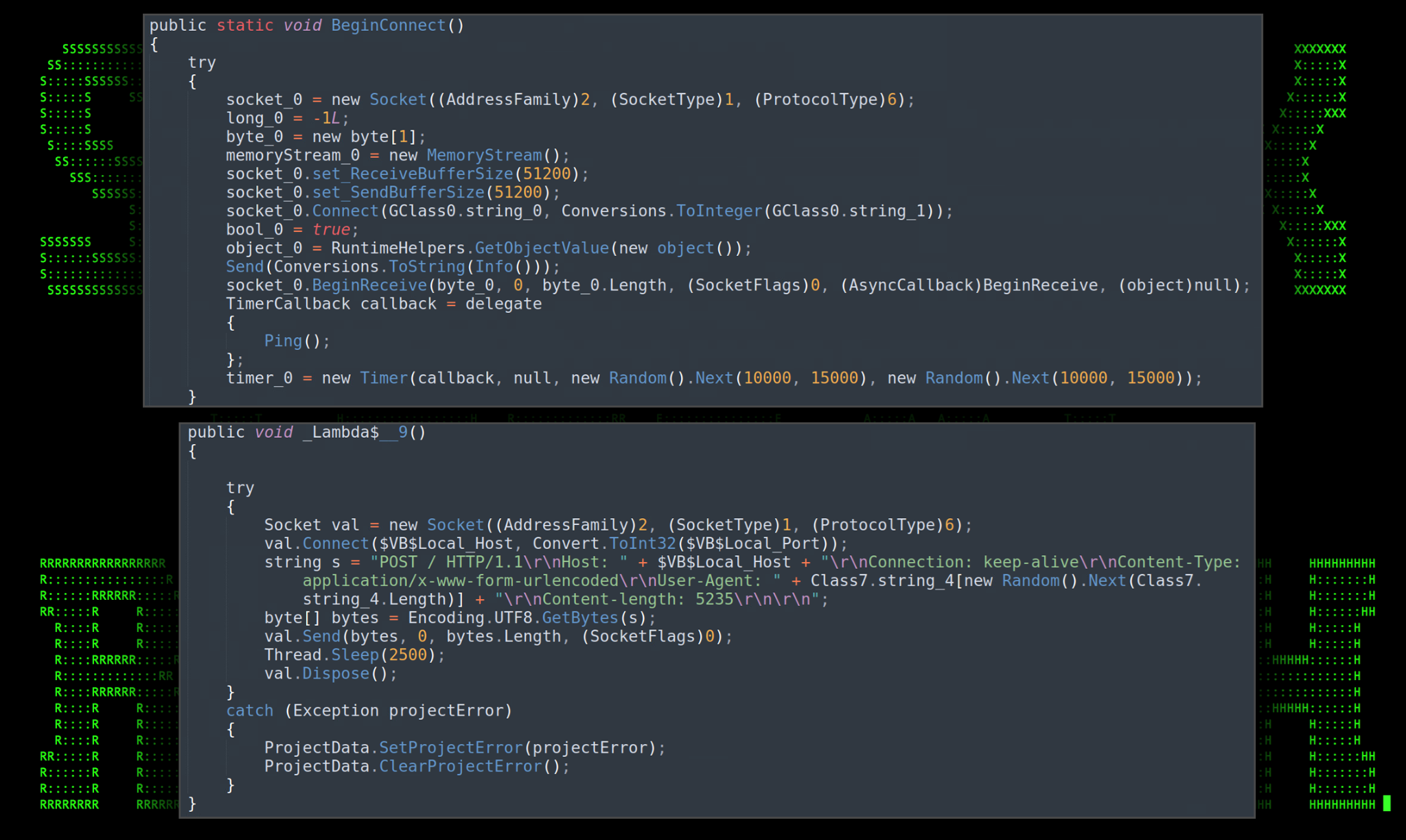 Circling back to the C# script portion of the original PowerShell script, there are two variables which contain binary file data. Both are heavily obfuscated .NET binaries which leverage the unlicenced version of .NET Reactor to hide the original source code.