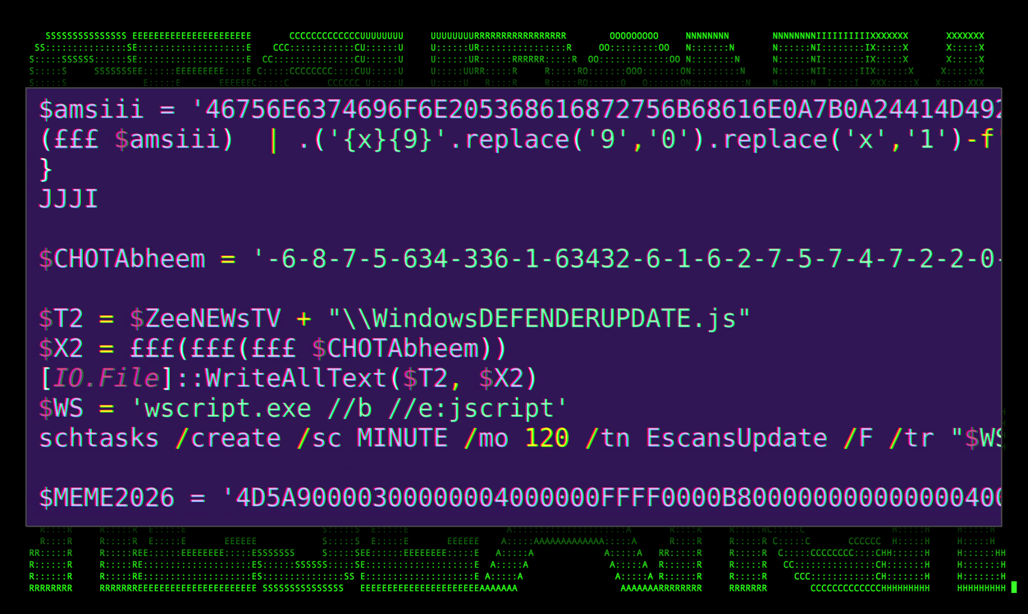 Persistence is established by writing the obfuscated JScript code to disk and saving it as \ZeeNEWsTV\UpdateEscan.js using the WriteAllText method. A scheduled task is then created called EscanDissldo referencing the newly created file that runs once every 200 minutes.