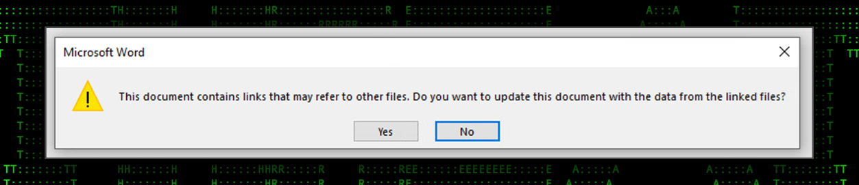Throughout the rest of this article, we’ll follow the attack chain of one document, though others were overall similar and produced the same final result. In this example, the email attachment is a single Microsoft Word document file named “Details for booking.docx”. When opened, a prompt to the user appears before any content is displayed asking the user if they want to update the document with externally linked files.