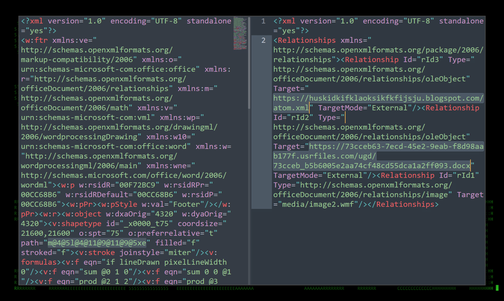 In this example, the document footer contained a shape object that was used maliciously. The shape object used the footer relationship file “footer2.xml.rels” to fetch the external objects.