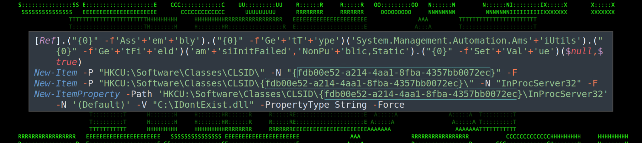 Next, a registry key is created under “HKCU:\\Software\Classes\CLSID\{fdb00e52-a214-4aa1-8fba-4357bb0072ec}\InProcServer32”  with a default value set to “C:\IDontExist.dll” This registry change also assists in disabling AMSI by overriding the Microsoft Defender COM object for AMSI and points it to a DLL that doesn’t exist.