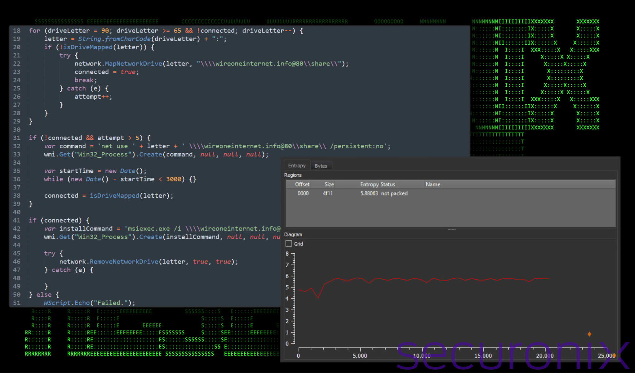 The script then checks for available drive letters ranging from A to Z and tries to map a selected drive letter to a network share located at \\wireoneinternet[.]info@80\share\ using a loop moving backwards from the letter Z.