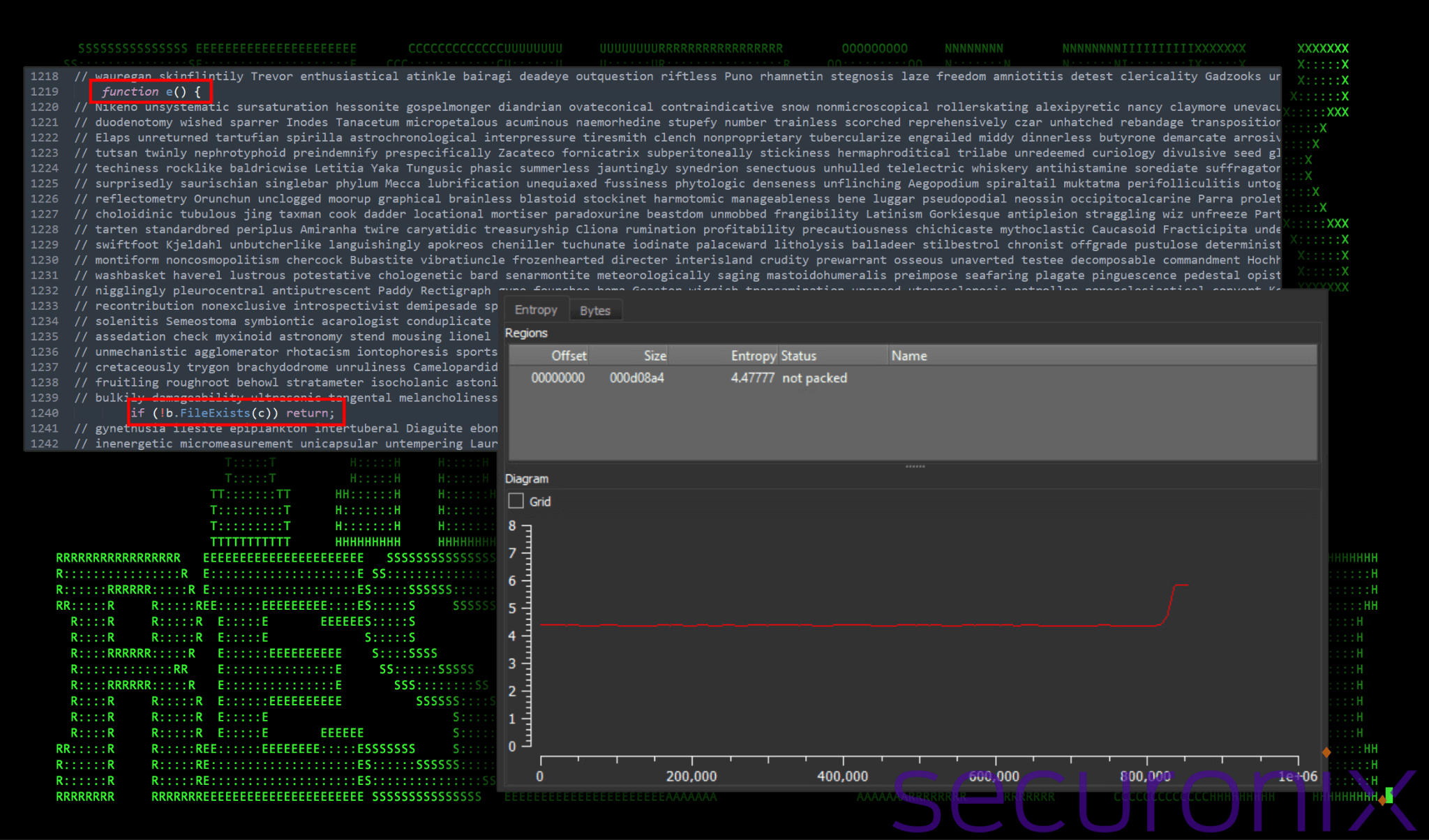 The useless comments drowned out the legitimate code so much that it caused the entropy of the file to drop significantly. Since they took up so much of the total code volume, the entropy looked incredibly flat when viewed in a graph, hardly deviating from 4.478 on the Shannon entropy scale. A deviation this low would place the script into the range of a standard text file, not too different from the classic “Lorem ipsum” text which scores only 4.179.