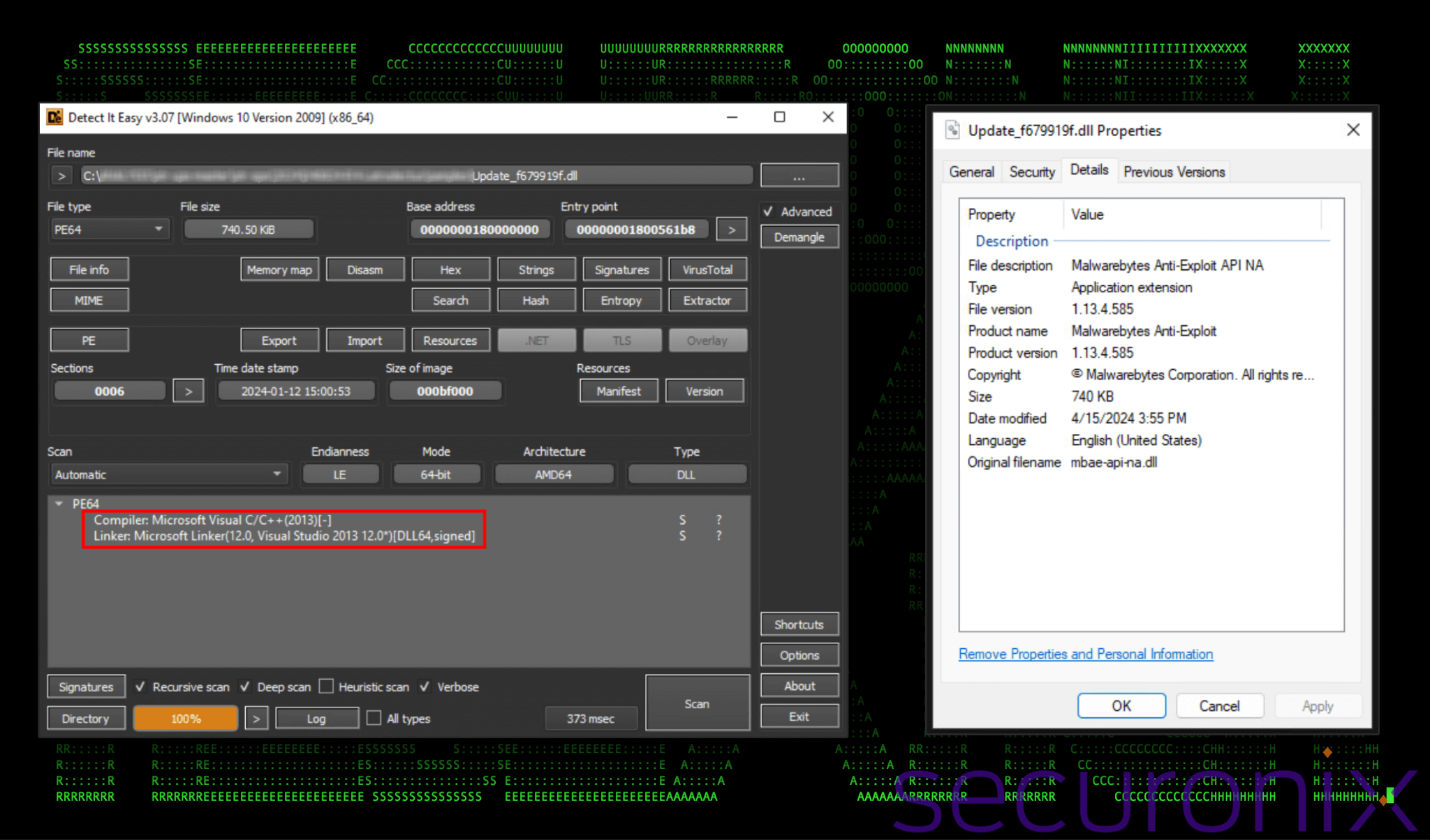 The file is digitally signed, however with an invalid certificate. It attempts to masquerade as Malwarebytes Anti-Exploit software. The legitimate Malwarebytes DLL is named the same (as the original DLL) and is typically located in C:\Program Files\Malwarebytes\Anti-Malware\mbae-api-na.dll.