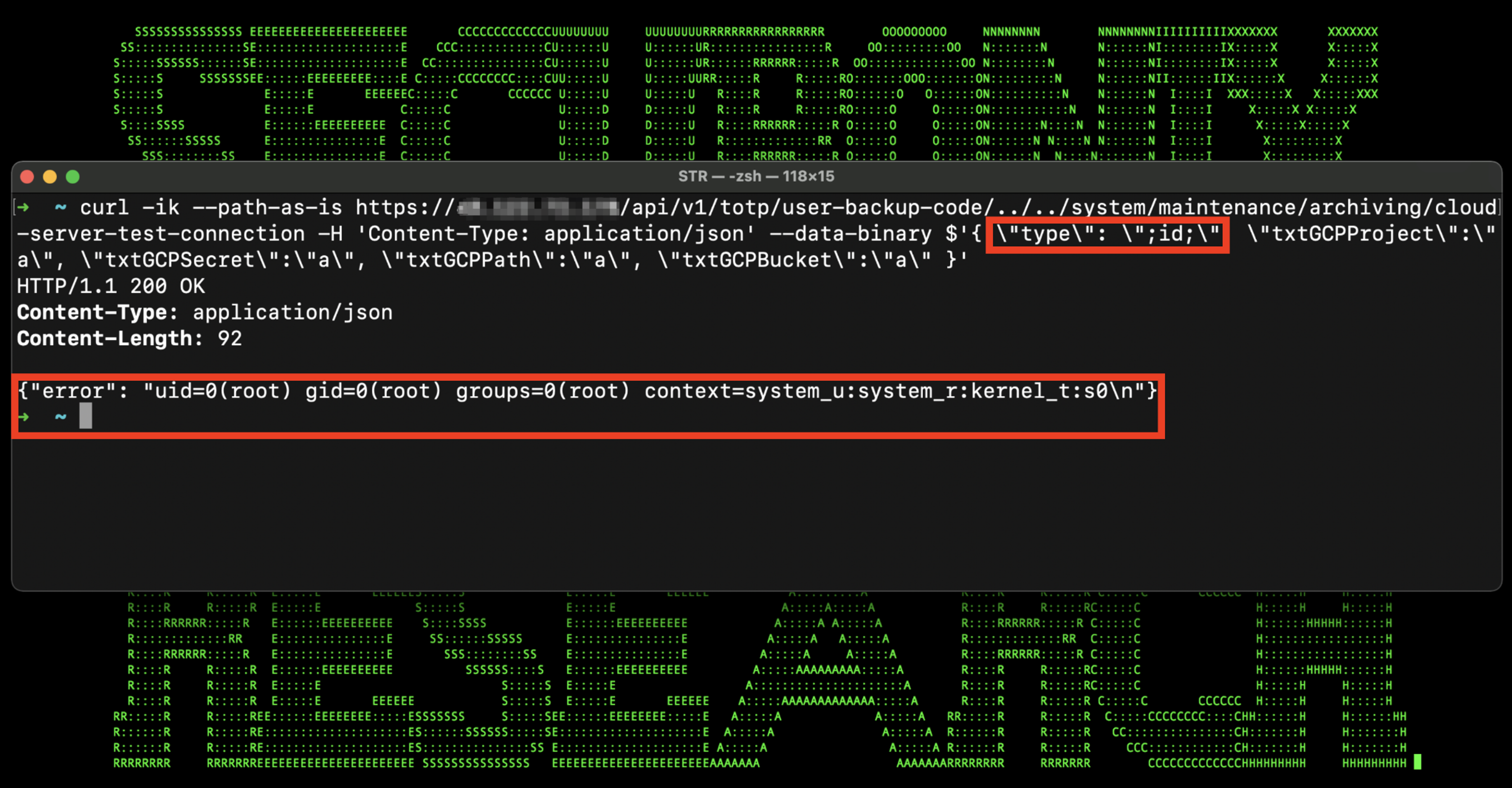 In the figure above the curl example we referenced earlier was executed against a vulnerable appliance. Once the exploit allows the Linux “id” command to execute, (“type”: “id”) the command is executed against the server and it returns the output of the command: