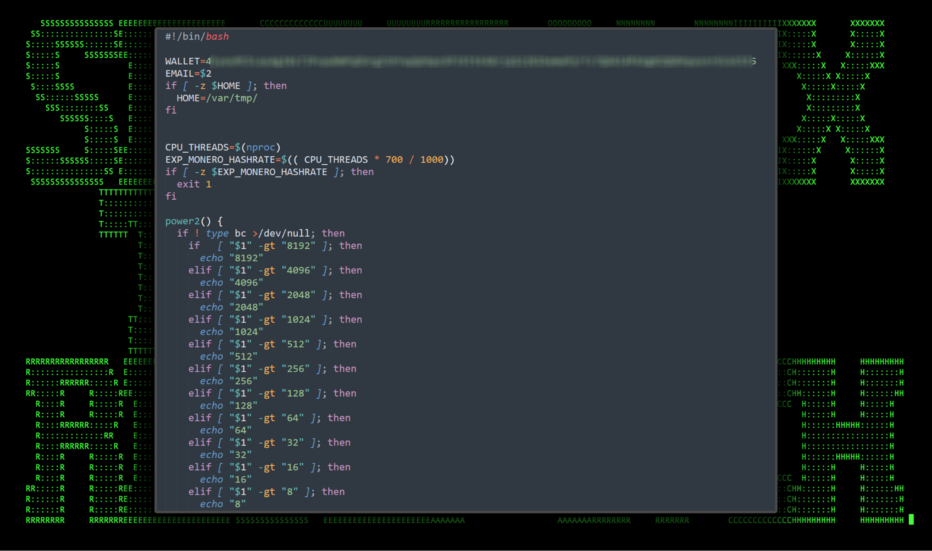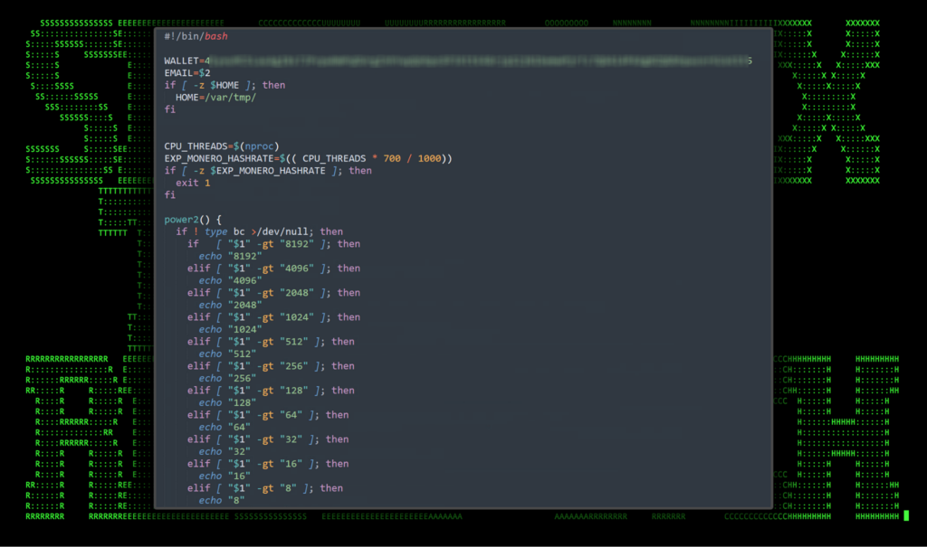 Figure 4: Contents of crypto mining script (d9a10f4568b649acae7bc2fe51fb5a98.sh)