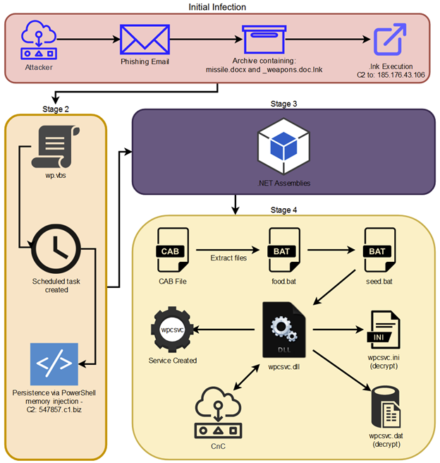 The Base64 payload is executed as another PowerShell stager which initiates C2 communication and downloads and runs both “weapons.doc” and “wp.vbs” files.