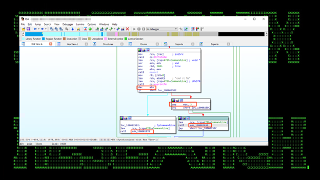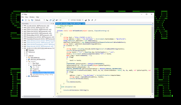 The next module, shell.net.exe was leveraged and provided the threat actor an “interactive shell” that would check and run commands from the attacker every 10 seconds. The loaded module can be seen in figures 14-16 below.