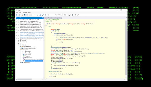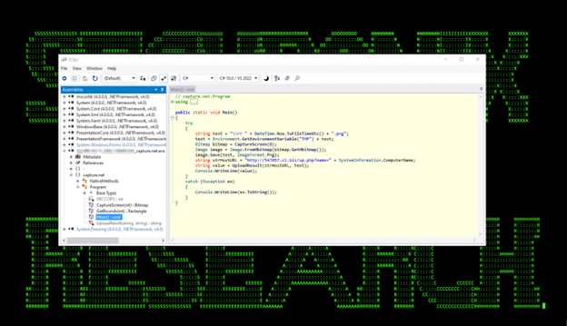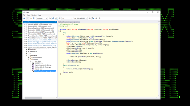 Capture.net.exe which was used to create a screenshot using Win32 GDI API and upload the gzipped results to the C2 server. This can be seen in figures 8 and 9 below.
