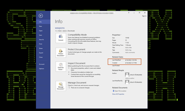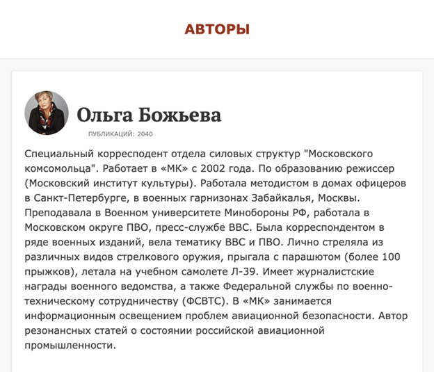 The lure document was allegedly created by Ольга Божьева (Olga Bozheva) on Jun 16, 2022. The name and other metadata can be seen in figure 5. The alleged author is known to be a war correspondent in Russia (see figure 6.1)