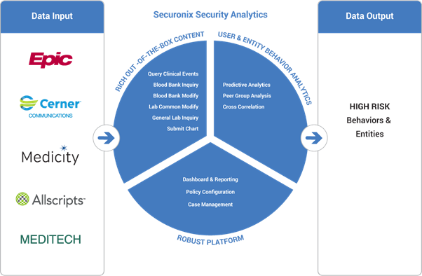 Securonix ingests nearly unlimited volumes of data from a wide varitey of sources. The platform connects seamlessly to industry standard healthcare applications including, but not limited to, Epic, Cerner, Medicity, All Scripts, and Meditech.