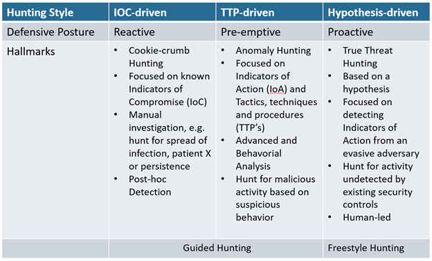The table below outlines three different threat hunting styles. You will find that there are similar but slightly different variations of this around. SANS for example published a more verbose but similar categorization that also considers maturity.