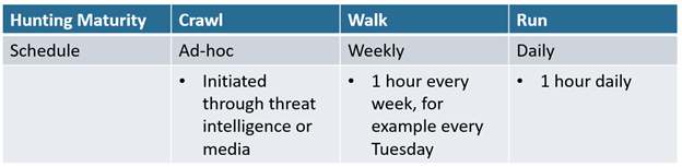 It is possible to take a crawl, walk, run approach to threat hunting by gradually increasing the amount of time spent on conducting hunting exercises.