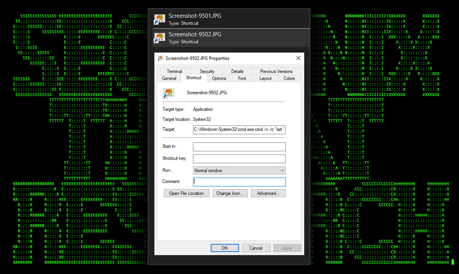 Figure 1: [OCX#HARVESTER] Shortcut .lnk file lure (Screenshot-9502.JPG.lnk)
