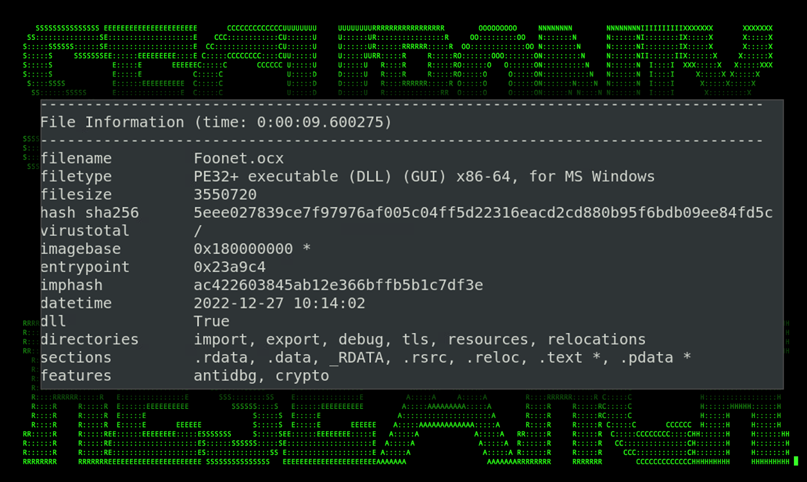 The binary file Foonet.OCX#HARVESTER and bonet.OCX#HARVESTER was also identified as a 64-bit PE executable masquerading as a DLL file. Similar to the others this binary was also compiled in C++ using Visual Studio. Both were identical file sizes and produced similar data when analyzed.